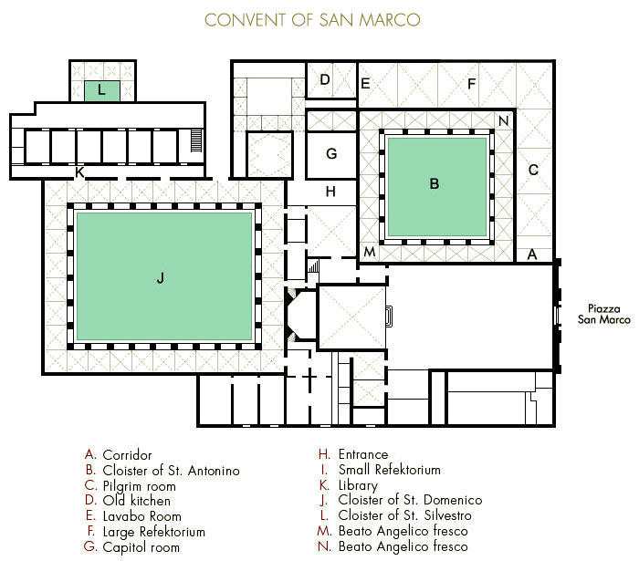 De nombreuses grandes figures de la culture et de la spiritualité du XVe siècle ont vécu et travaillé dans le couvent : Cosme l’Ancien de Medici, qui avait sa propre cellule, où il aimait prier et méditer, l'archevêque Saint Antonin, le bienheureux Fra Angelico, qui a peint les fresques, et, à partir de 1489, Fra Girolamo Savonarola, qui dans ses sermons fulminait contre l’immoralité de l’époque, et qui fut pendu et brûlé sur la Piazza della Signoria (1498). Fra Angelico décora les cellules du premier étage et d’autres espaces du couvent de fresques chargées d’une profonde signification spirituelle et ascétique; il commença par les lunettes au-dessus des portes du cloître de Saint-Antonin (B), que Michelozzo avait fait construire avant 1440. Les lunettes de la voûte du cloître furent peintes à fresque à la fin du XVIe et au début du XVIIe siècle par Bernardino Poccetti et d’autres artistes avec des scènes de la vie et des miracles de Saint Antonin.