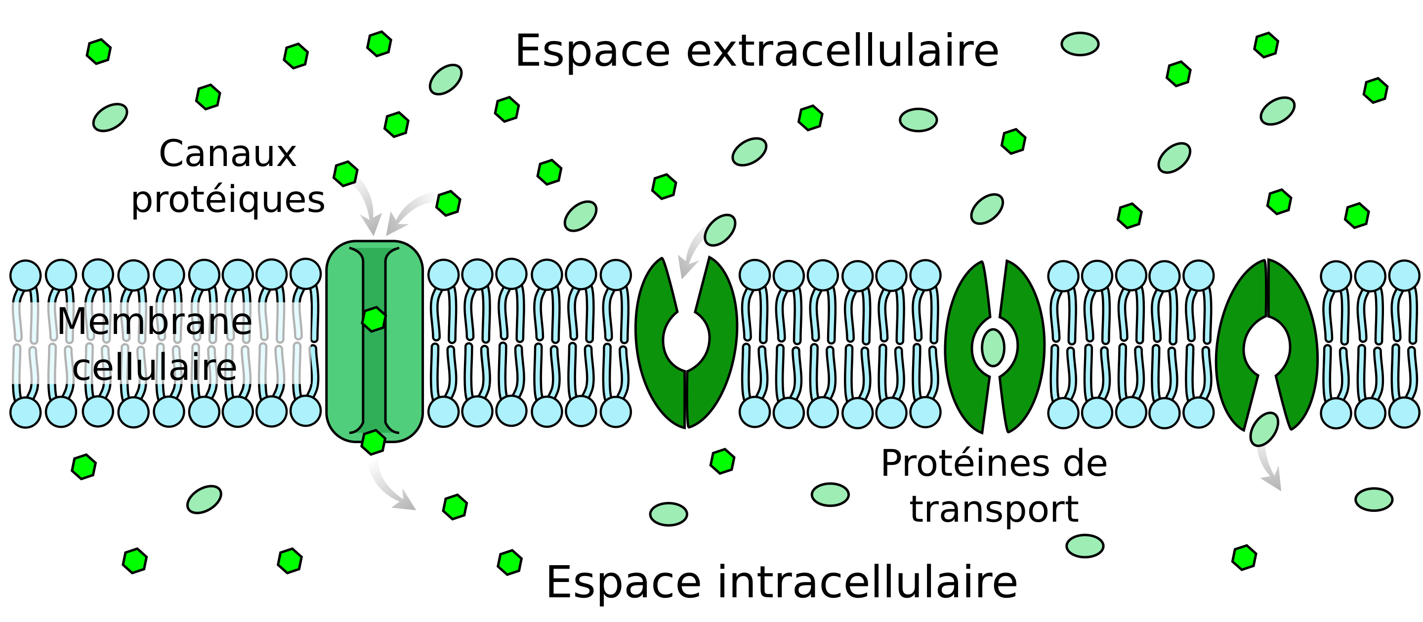 - Toute une série de petites molécules trop peu lipophiles pour pouvoir diffuser entre les phospholipides sont transportées au travers des parois des cellules endothéliales grâce à des stuctures formées de protéines, mais qui contrairement aux canaux, ne sont pas passifs, mais s'ouvrent vers l'extérieur pour capter la molécule, puis la transporte vers l'intérieur. Ces transporteurs sont nécessaires pour des molécules telles que le glucose ou certains acides aminés.